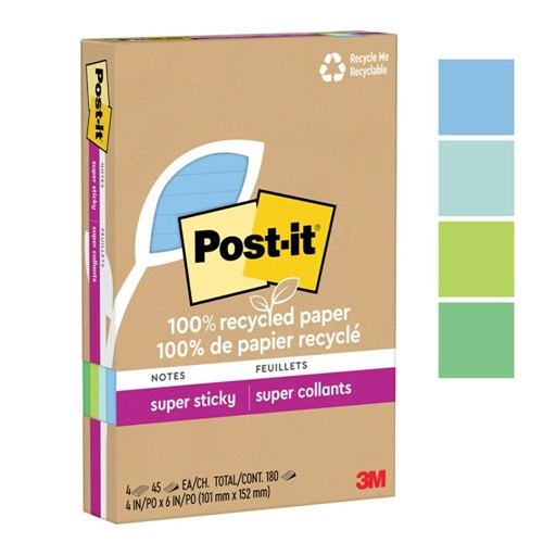 Post-It 4621R-4SST Lined Super Sticky Notes Recycled 101mm x 152mm Oasis Pack Of 4